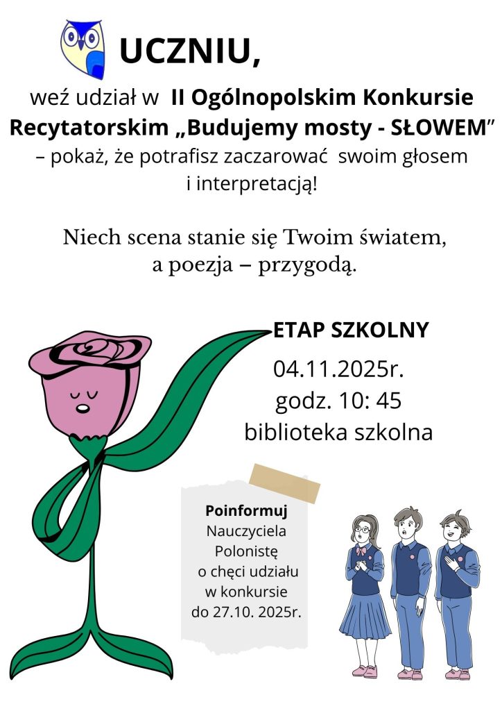 7 listopada 2025 roku w naszej szkole odbyła się akademia z okazji Narodowego Święta Niepodległości, upamiętniająca 107. rocznicę odzyskania przez Polskę wolności. Uczniowie zaprezentowali wiersze i pieśni patriotyczne, a całość przebiegła w podniosłej atmosferze. O godzinie 11:11 społeczność szkolna wzięła udział w akcji „Szkoła do hymnu”, wspólnie śpiewając „Mazurka Dąbrowskiego”. Była to piękna lekcja historii i patriotyzmu.