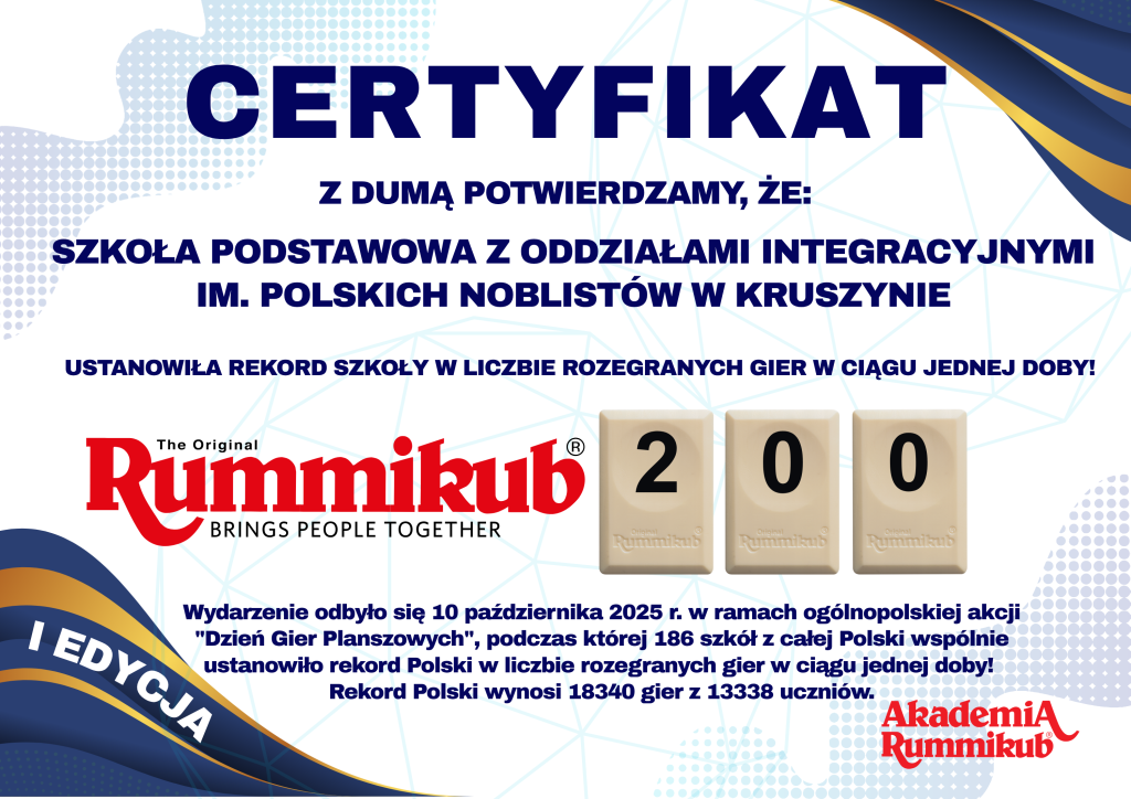 10 października z okazji Dnia Gier Planszowych 48 uczniów naszej szkoły przyłączyło się do Ogólnopolskiej Akcji Bicia Rekordu Polski w liczbie rozegranych partii gry Rummikub.