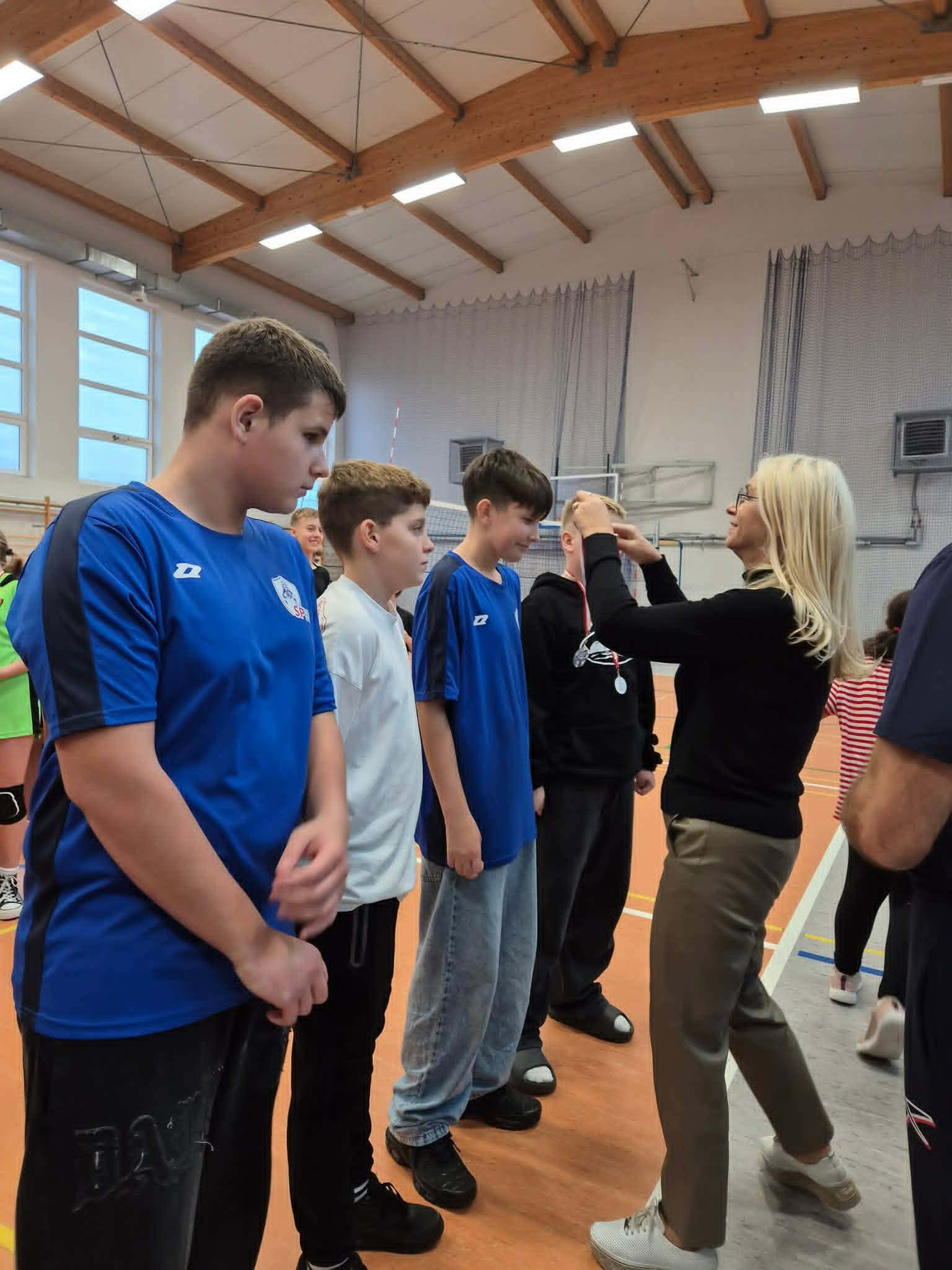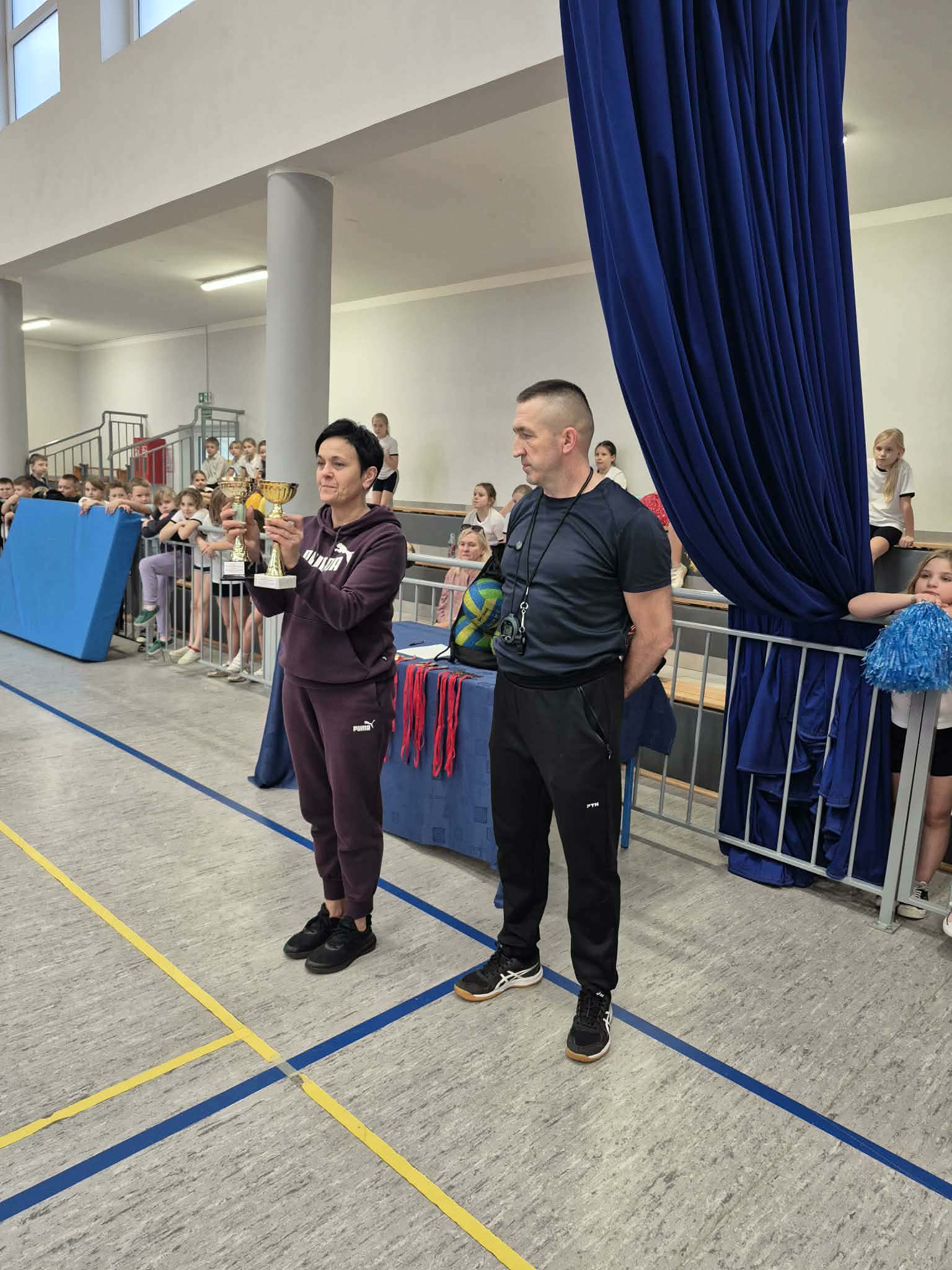 Swoją obecnością zaszczyciła nas Pani Wójt Gminy Włocławek, która z dużym zaangażowaniem obserwowała sportowe zmagania, a na zakończenie osobiście wręczyła medale i puchary wszystkim uczestnikom. Pani Wójt skierowała ciepłe słowa w stronę młodych sportowców, gratulując im pasji i hartu ducha, a także złożyła serdeczne podziękowania dyrektor szkoły oraz nauczycielom wychowania fizycznego za doskonałe przygotowanie i sprawne przeprowadzenie wydarzenia.