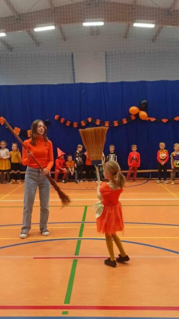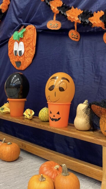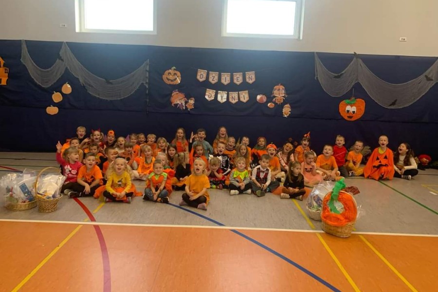 27 października całe przedszkole zamieniło się w dyniową krainę, w której królował pomarańczowy kolor. 🟠🟠🟠 Dzieci zaprezentowały się w niecodziennych kreacjach. Na balu pojawiły się czarownice,🧙‍♀️ pająki 🕷️🕸️oraz wiele innych barwnych dyniowych postaci. Radości ze wspólnych tańców i zabaw nie było końca. Każdy z nas sprawdzał swoje taneczne umiejętności uczestnicząc między innymi w tańcu z miotłą, zabawie ,,nakarm dynię „. Sala balowa udekorowana była oryginalnymi, pięknymi okazami dyń posiadających różną wielkość i kształt. Było niezwykle pięknie i pomarańczowo !