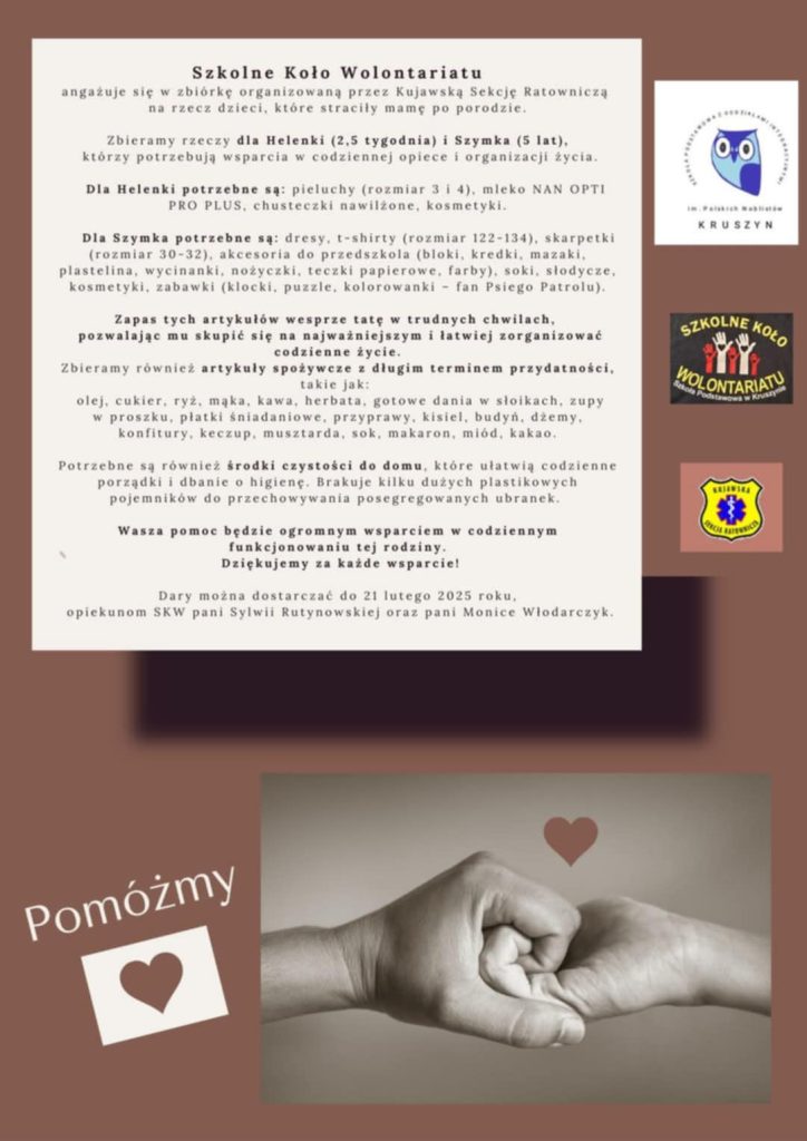 W imieniu Dyrekcji Szkoły Podstawowej z Oddziałami Integracyjnymi im. Polskich Noblistów w Kruszynie, Kujawskiej Sekcji Ratowniczej oraz Szkolonego Koła Wolontariatu, pragniemy serdecznie podziękować za wsparcie zbiórki darów dla rodziny, która znalazła się w trudnej sytuacji! Jak zawsze społeczność naszej szkoły okazała ogromne serce!