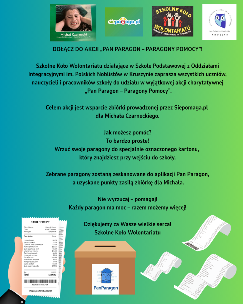 Szkoła Podstawowa z Oddziałami Integracyjnymi im. Polskich Noblistów w Kruszynie  przy udziale uczniów  i Szkolnego Klubu Wolontariatu zorganizowała zbiórkę dla chorych dzieci będących pod opieką Hospicjum Polskiego Towarzystwa Opieki Paliatywnej Oddział we Włocławku