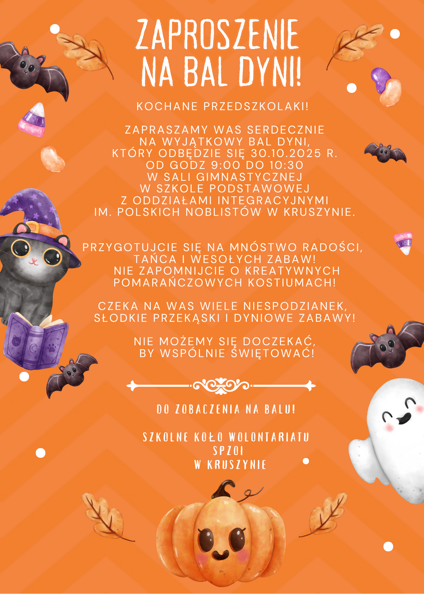 Dzieci z grup przedszkolnych wzięły udział w Balu Dyniowym. 🎃🎃🎃 Były wesołe zabawy, tańce i ciekawe konkursy związane z jesienią i dyniami. Przedszkolaki miały piękne stroje w kolorze pomarańczowym, dzięki czemu sala wyglądała naprawdę wyjątkowo. W przygotowaniach do balu pomogło Szkolne Koło Wolontariatu, które dodatkowo prowadziło sklepik ze słodyczami. Dochód ze sprzedaży zostanie przeznaczony na działalność SKW, wspierającą niesienie pomocy potrzebującym. Był to dzień pełen radości, kolorów i wspólnego działania dla dobra innych! 🎃💛
